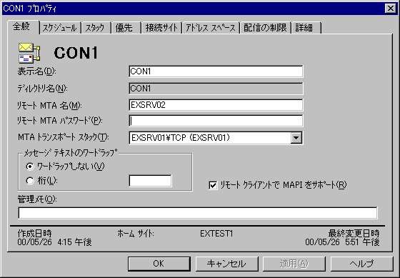 X.400コネクタをインストールするとX.400コネクタのプロパティダイアログが表示されます。