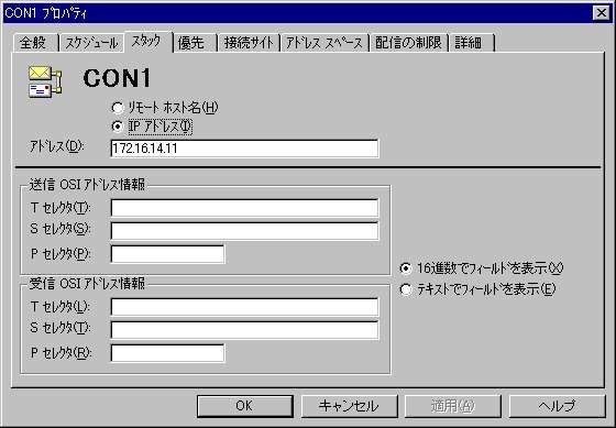 - 「アドレス」・・・リモートホスト名を選択した場合は接続先サーバ名を、IPアドレスを指定した場合はIPアドレスを入力します