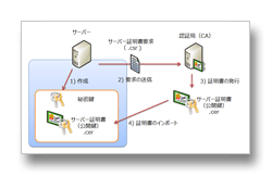 ※また認証局は Active Directory で提供されるCAや、自分自身で署名する自己署名などでもOKです。(単にブラウザが認証局を認識できなかったりして警告がでるだけで、通信の暗号化そのもには影響ありません。ただし発行元が信頼できないということですので、テストではよくても公開時はいろいろ問題になるので注意が必要です)