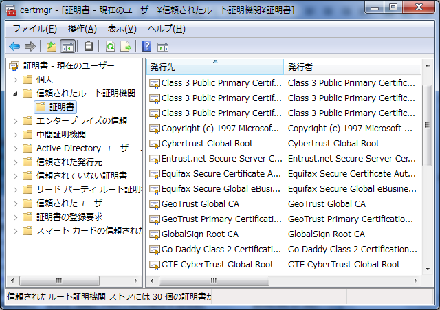 ※WindowsであればルートCAの証明書はあらかじめインストールされていたりしますね。(是非証明書管理コンソールで見てみてください。管理コンソールは certmgr.msc で表示できます。※Windows 7の場合)