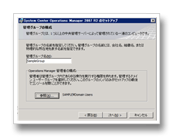 インストール時にSCOMの管理グループ名やDB、管理者アカウント等の指定を求められますがウィザードに従い設定するだけですのでそれほど迷う部分はないかと思います。(既定値でも問題ないぐらい)