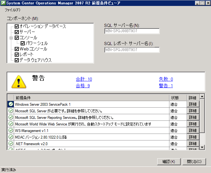 ドメインコントローラー上で実行されている場合、警告がでます。もし合格しない項目があれば詳細から足らないコンポーネントをチェックできますので、インストール等を行って再度確認します。