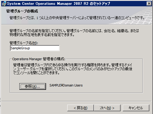 インストール時にSCOMの管理グループ名やDB、管理者アカウント等の指定を求められますがウィザードに従い設定するだけですのでそれほど迷う部分はないかと思います。(既定値でも問題ないぐらい)