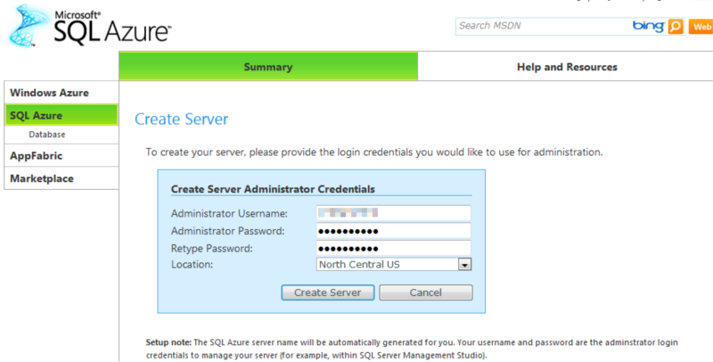 まずは公開するためのDBを用意します。SQL Azure 開発者ポータルに接続して、Create Server でサーバーを作成します。