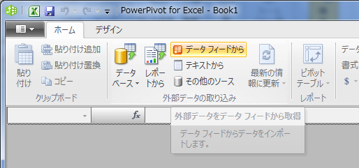 PowerPivot タブにある PowerPivotウィンドウ ボタンをクリックし、[外部データの取り込み]-[データフィードから]を選択します。