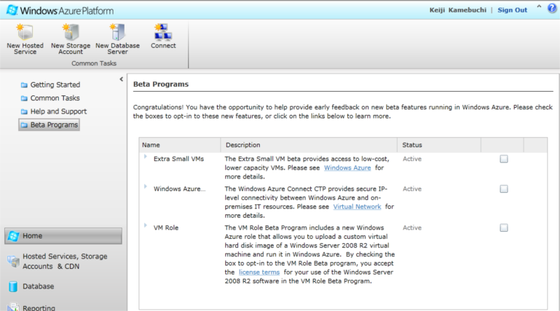 11月29日に Windows Azure の新機能が公開され、即日ベータ申込みしてはや10日。やっとこさ処理されたようでついに Active になりました!