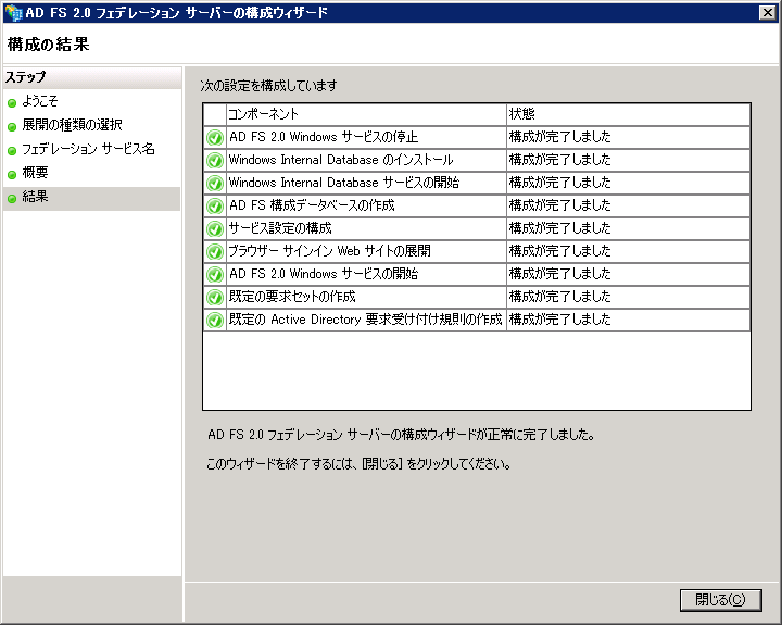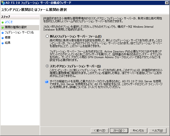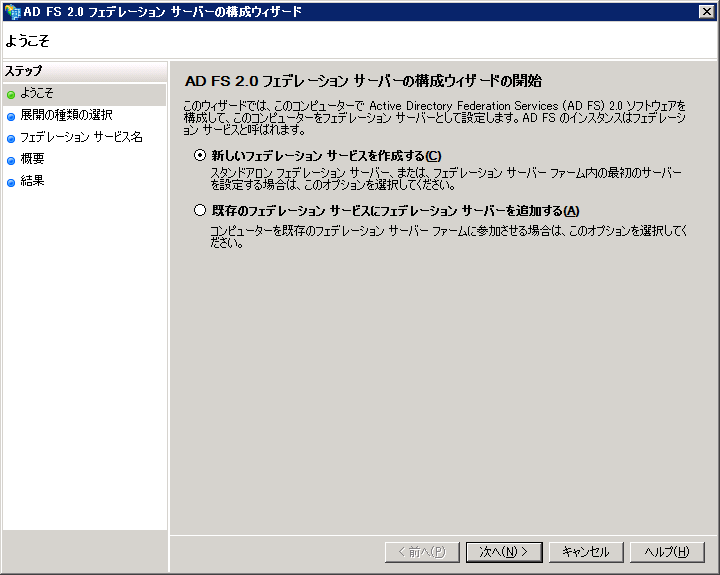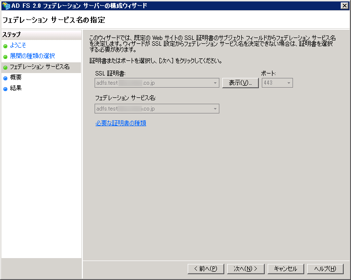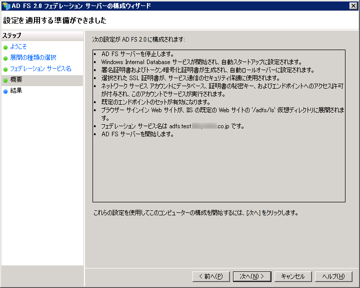 次にADFS 2.0 管理ツールから構成ウィザードを使用して構成します。設定項目としてはスタンドアロンで構成、SSL証明書には先ほどインポートしたものを指定します。