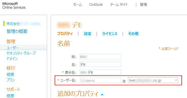 フェデレーション認証が有効になればあとはOffice 365側のユーザーのUPNをカスタムドメインに設定します。ここでは記載しませんが、Active Directoryと同期をとってもいいですね。(今回は個別に作成してドメインを設定します)