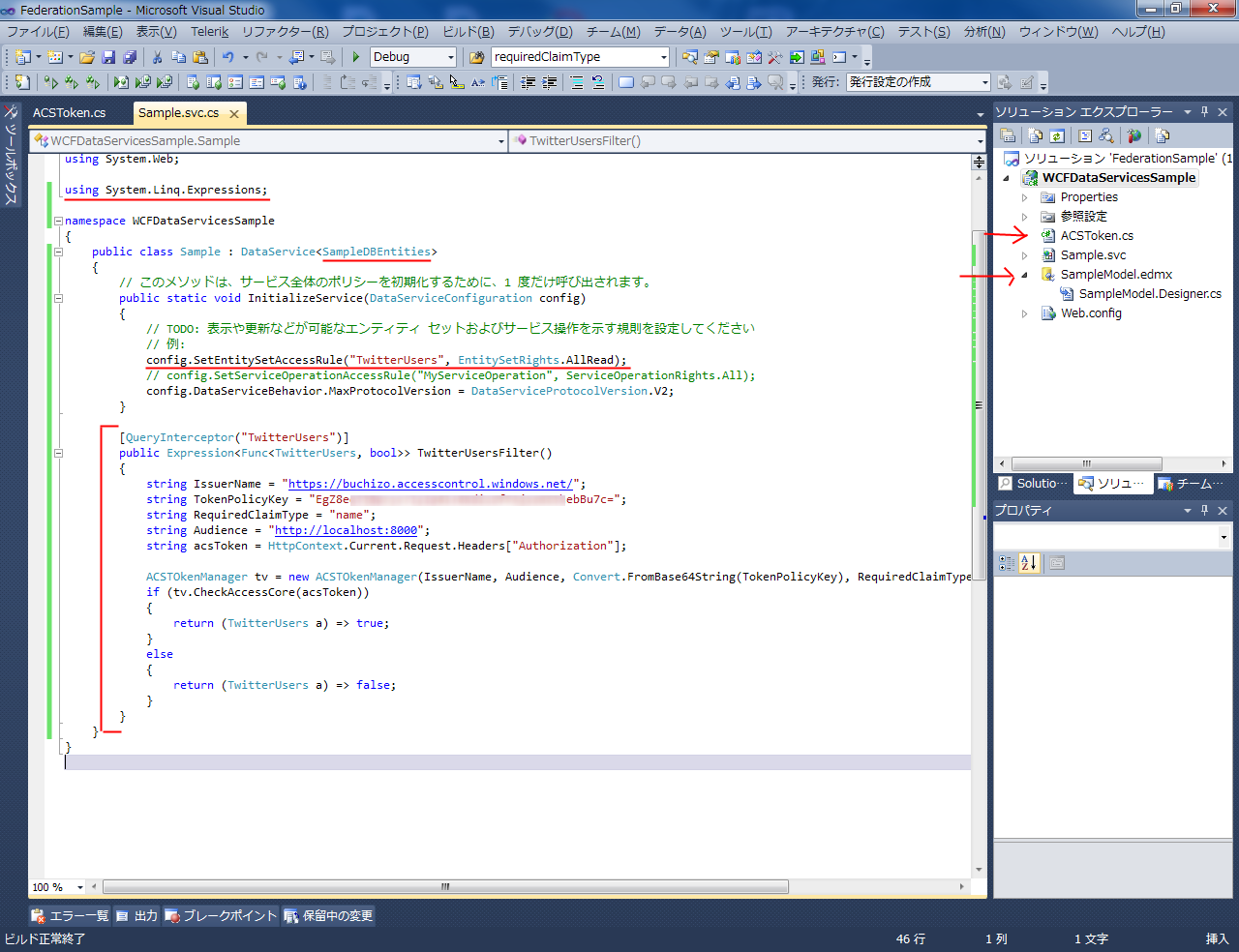 サービス側はWCF Data Servicesを利用して、トークンが有効な場合のみデータ(Entity)を返すようにします。