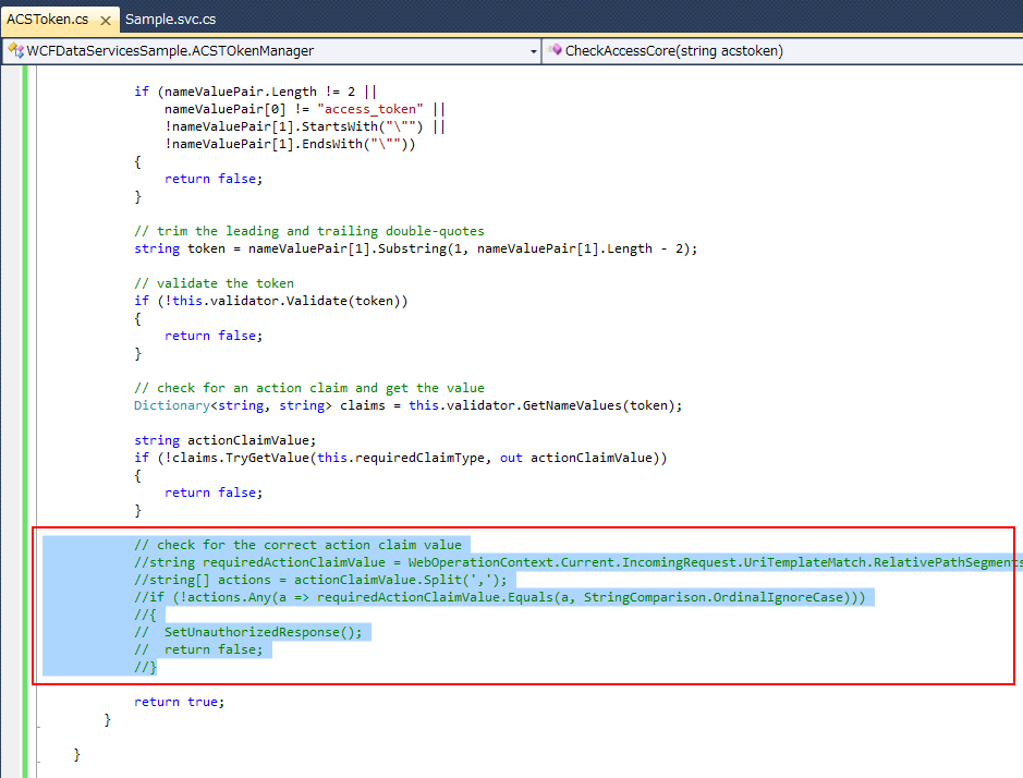 基本的にはハンズオンラボ内にあるACSTOkenManagerそのままで問題ありませんが、受け取ったクレームを列挙し確認する部分が今回のサンプルでは邪魔なのでコメントアウトでもしときます。