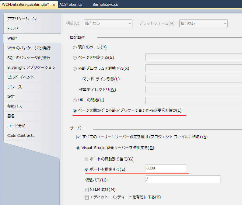 最後にWCF Data Servicesが指定したURLで動作するように、プロジェクトの設定からポート番号の設定などを行います。