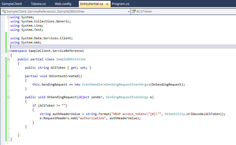 次に、最終的に取得したトークンを含めてWCF Data Servicesにアクセスできるように、EntitiesのPartialクラスを作成します。