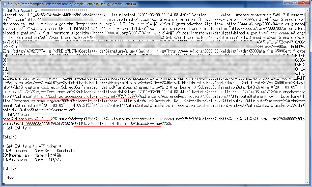 正しく設定されていればちゃんとトークンを取得して最終的にWCF Data Servicesからデータを取得できることがわかります。