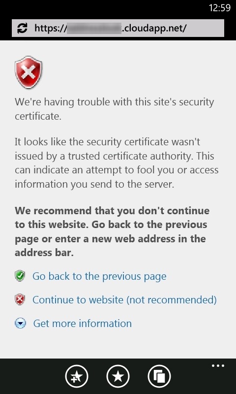 Windows Phone 7(実機なのでNoDo)のInternet Explorerで警告のでるHTTPSなサイトにアクセスすると、PCと同じように警告が表示されます。