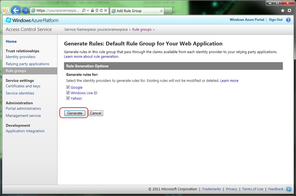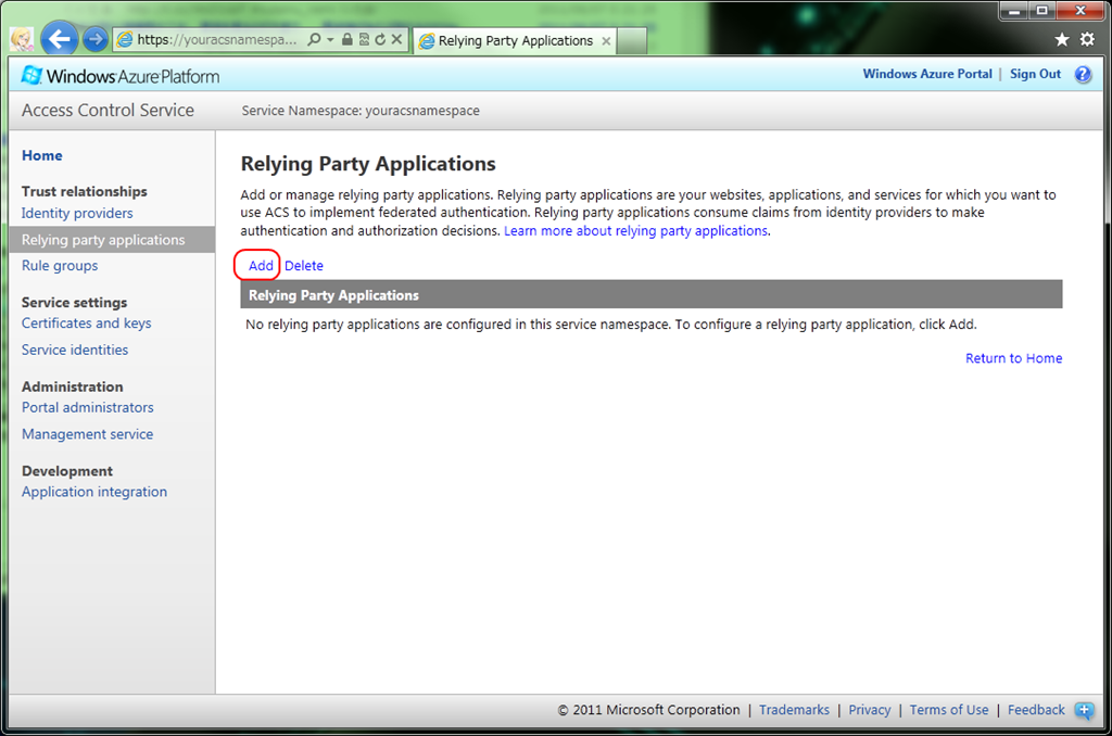 このチュートリアルではWindows Azure AppFabric ACSのサービスネームスペースと、ASP.NET RelyingPartyアプリケーションを新規作成します。