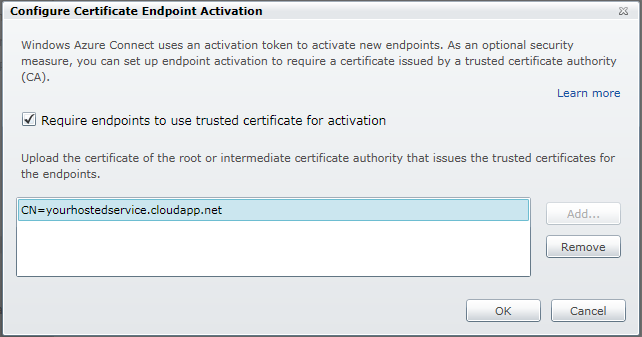アクティベーションオプションは、Windows Azure Connect Endpointソフトウェアがアクティベートされるとき(接続を確立するときですかね)に任意の証明書を使って信頼できる接続先かどうか確認できるようです。