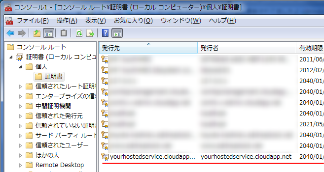 「証明書(ローカルコンピューター)」 – 「個人」 – 「証明書」に証明書を登録しましょう。また登録した証明書を.cer形式でエクスポートしたものをWindows Azure開発者ポータルの上述のダイアログでアップロードしておきます。