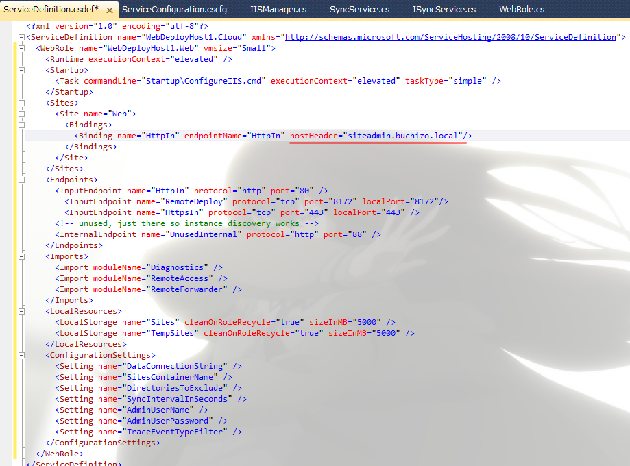 Web Roleのエントリポイント内では、同期のサービスが実行されて管理用サイトにて設定された情報(Windows Azure Storage上の情報)をみて、設定に応じてIIS上にWebサイトの作成や、アプリケーションファイルのコピーを行います。また監視も行っており変更があればWindows Azure Storageにコピーしたりします。