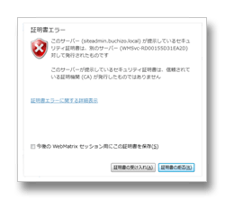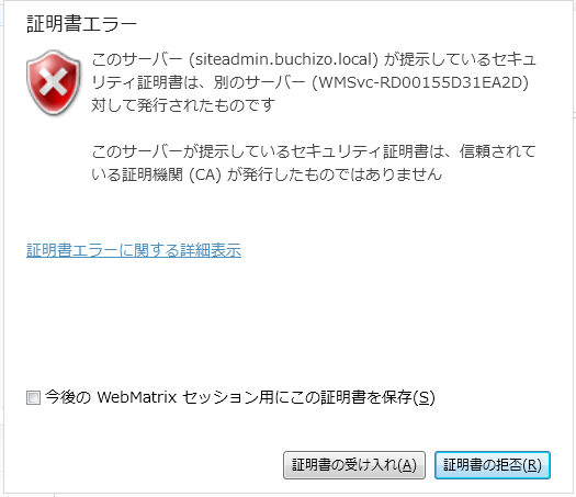 さて設定は以上で終了です。実際に発行してみると、初回は以下の証明書エラーが表示されます。
