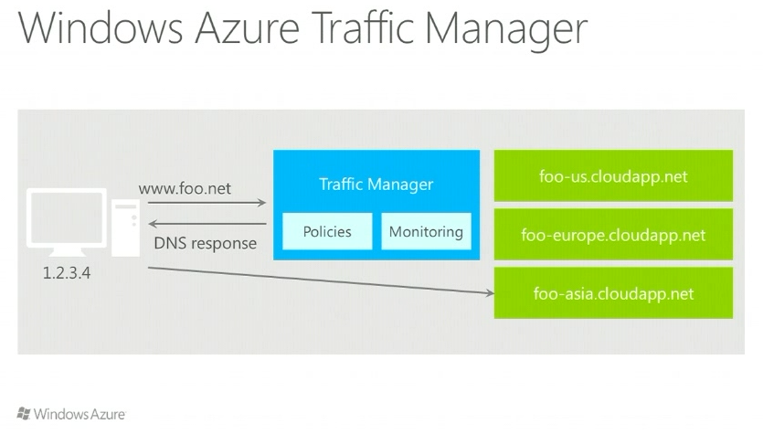 Traffice ManagerはDNSのレコードをうまく管理することでクライアントに近いデータセンターに接続するように応答を返したり、アプリがダウンした場合に別の拠点のアプリに振り替えたりすることができます。