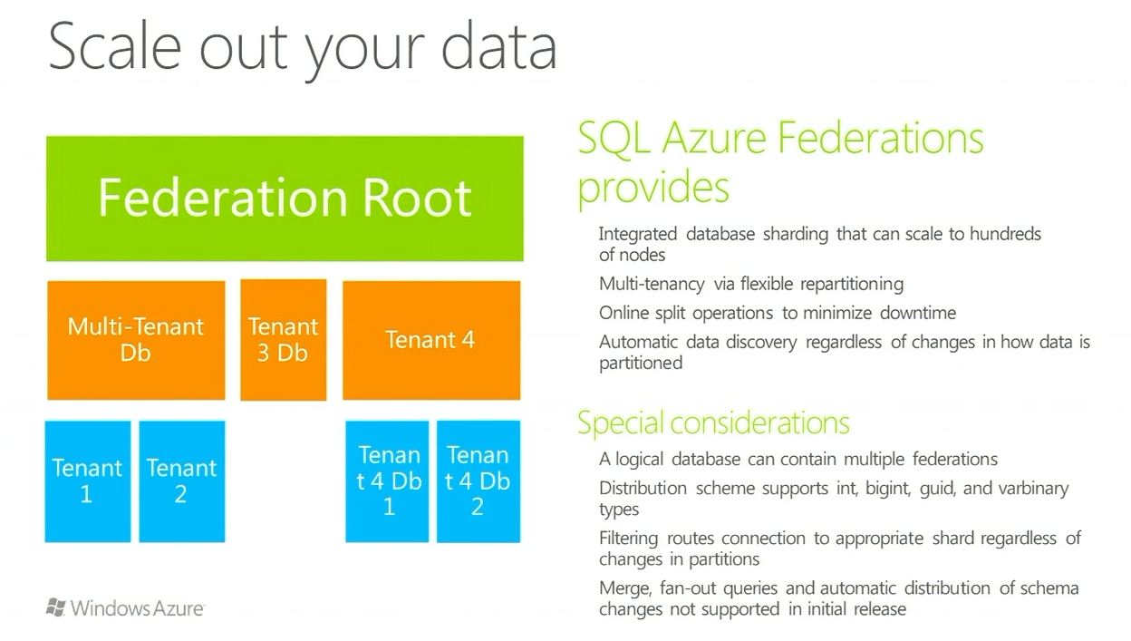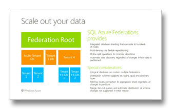 今までSQL Azureはスケールアップもスケールアウトもサポートされていませんでした。スケールアウトは手動でDB分割するとかアプリケーション側で工夫する必要がありましたが、SQL Azure Federationを使うと簡単に(透過的に)DBを分散させてスケールアウトが行えます。