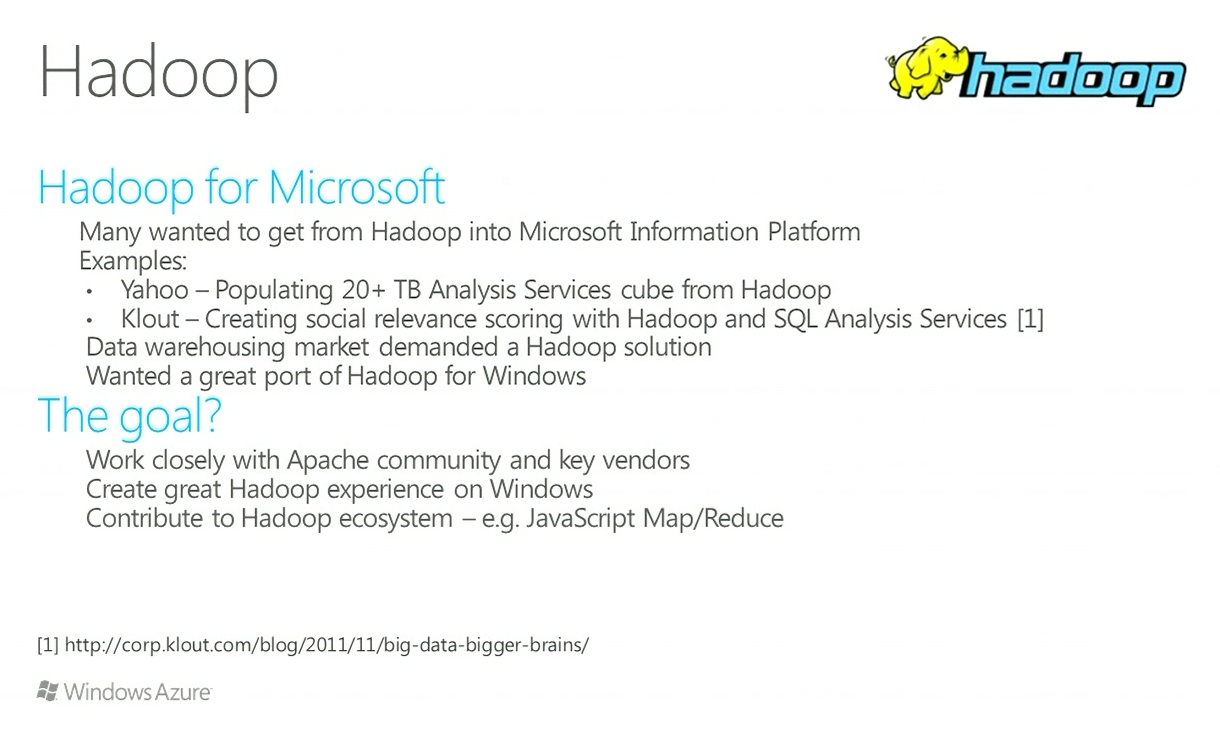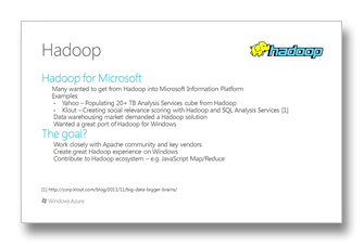 MSのアプローチの1つとしてHadoopへのコミットが挙げられました。