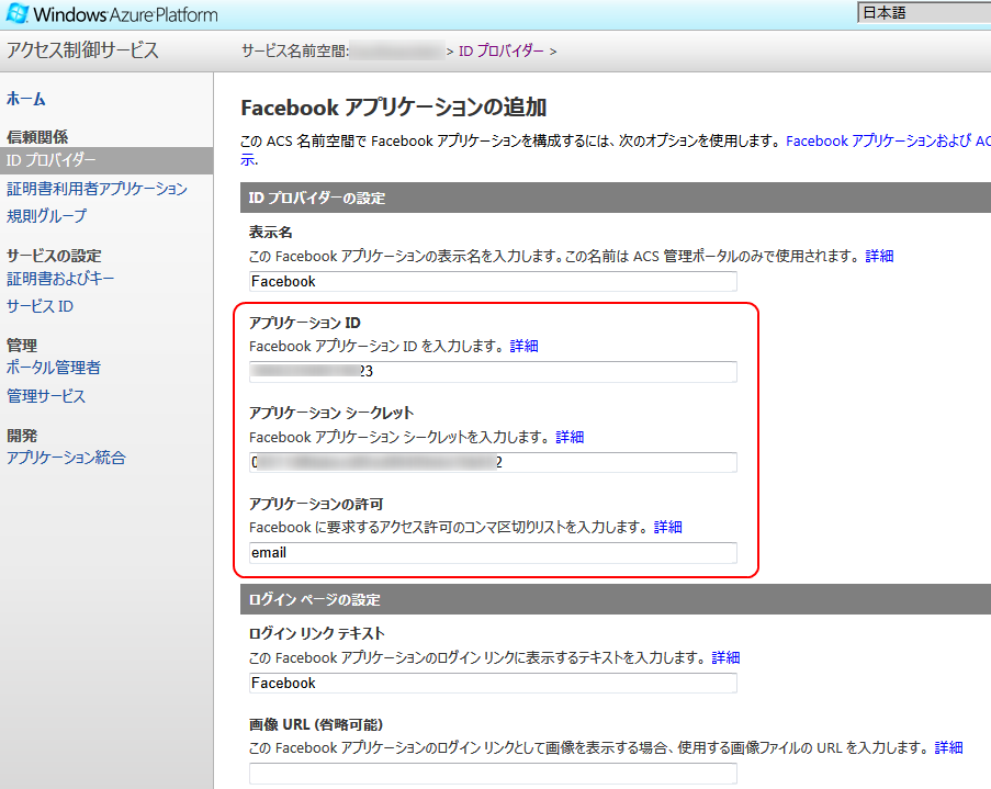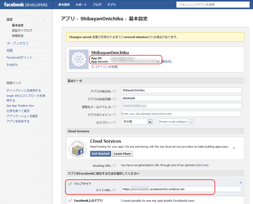 App ID、App SecretはACSv2側で利用するので控えておきましょう。あとアプリのドメイン欄にはACSv2のURLを入力して保存します。(例: https://youraccount.accesscontrol.windows.net ※HTTPSを含めるようにします)