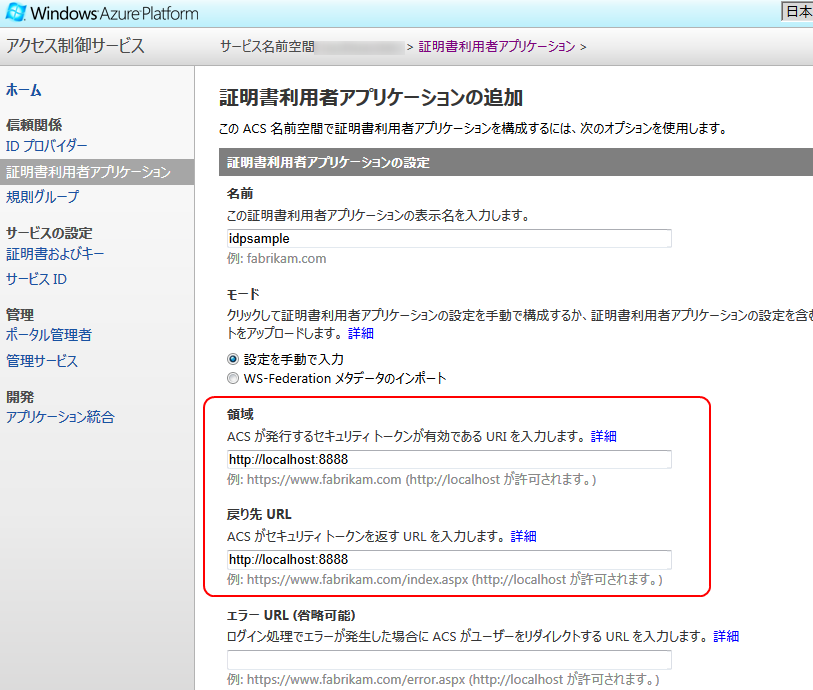領域と戻り先URLはアプリケーションにあわせましょう。