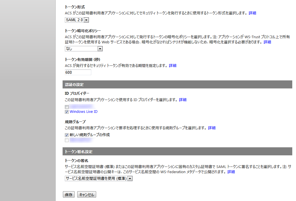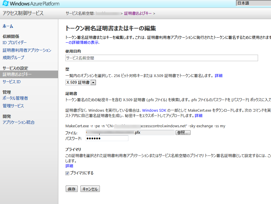 もし”The security token service descriptor does not contain any key descriptors”といったエラーが表示される場合はACSv2側のプライマリキーがX.509証明書になっていない所為なので、証明書を作ってアップロードしてプライマリに設定しておきます。