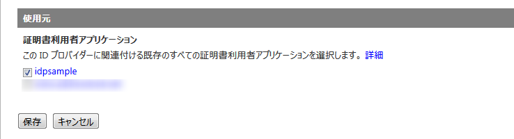 同じページの下の方に使用元欄があるので、先ほど作成した証明書利用者アプリケーションにチェックを付けて保存します。
