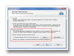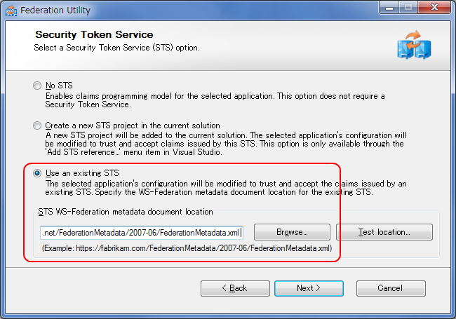 STSの設定は既存のSTSを選択し、WS-Federationメタデータの場所はACSv2の管理ポータルにある情報をコピペします。