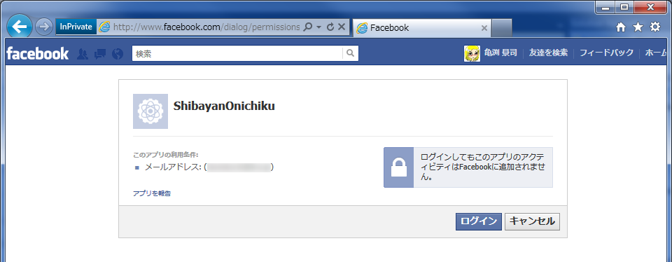 選択するとそれぞれのIdPのログイン画面にまたリダイレクトします。Facebookのログイン画面ではちゃんと設定したアプリケーション名が表示されてますね。