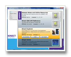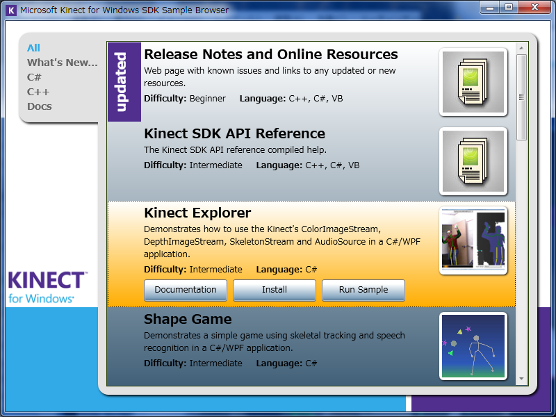 この中のKinect SDK Sample Browserを使うと、簡単にサンプルをみたり実行したりすることができるようです。