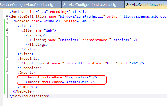 組み込む方法はサービス定義ファイル(*.csdef)にImportを追加してAntimalwareを指定するだけです。※Diagnosticsも使ってるようで同様にImportされていないとエラーになるので注意