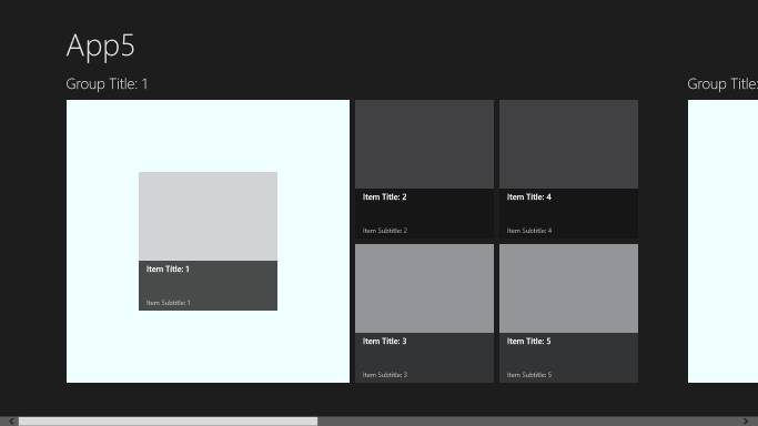今回はGridAppテンプレートそのまま使ってるので、SampleDataItemのタイトルがItem Title: 1のアイテムだけ2×2なサイズで配置するようにします。適当なので適宜修正しましょう。