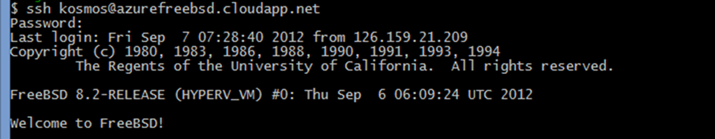 Congrats! You will be able to connect to SSH and other services to FreeBSD VM on Windows Azure VMs.