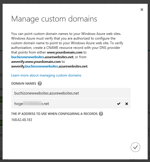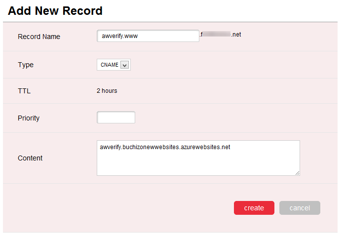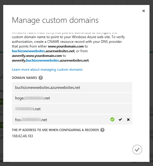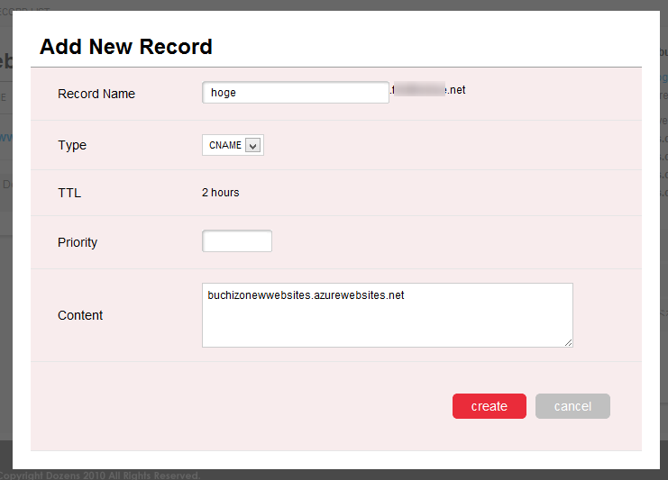 Aレコードの場合、ちょっと面倒です。というのもWindows Azure側でベリファイが必要なので、指定されたCNAMEを持つレコードを作成しておく必要があります。