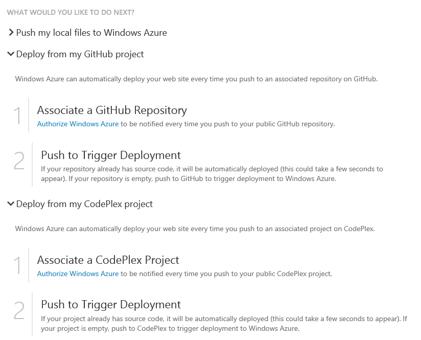 Windows Azure WebサイトにてGit連携を行った場合、これまでWindows Azure上のGItリポジトリが利用できるだけでしたが、今回のリリースでCodePlexおよびGitHubと連携できるようになりました。