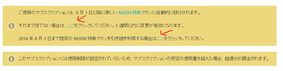 とりあえず旧MSDN特典のほうがいいなーという方は2014年8月1日まで問題を先送りにできるようなので、サブスクリプションの管理ページで既存のMSDN特典プランを引き続き利用をクリックしましょう。