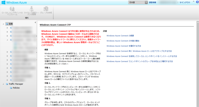 Windows Azure Connect は今年の夏に使用が中止されるため、Windows Azure Connect 機能はこのポータルから削除されます。その時点で、Windows Azure Connect は使用できなくなります。すぐに仮想ネットワークに移行してください。仮想ネットワークの管理作業は、新しい Windows Azure 管理ポータルで行うことができます。