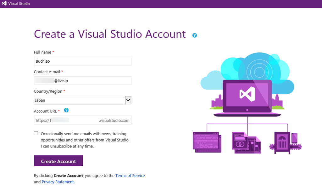 作り方はhttp://www.visualstudio.com/en-us/products/visual-studio-online-overview-vs からオファーを選んでサインインしましょう。
