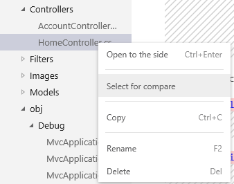 あとファイルはコンテキストメニューで他と比較したり、Gitで管理してれば変更内容と比較したりできます。