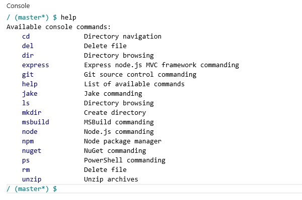 面白いのはnpmとかNode.js周りの機能もあることですね。 psコマンドで.ps1ファイルを渡してPowerShellを使うこともできます。※もっとWindowsなコンソールが必要ならKuduのほうを使いましょう。