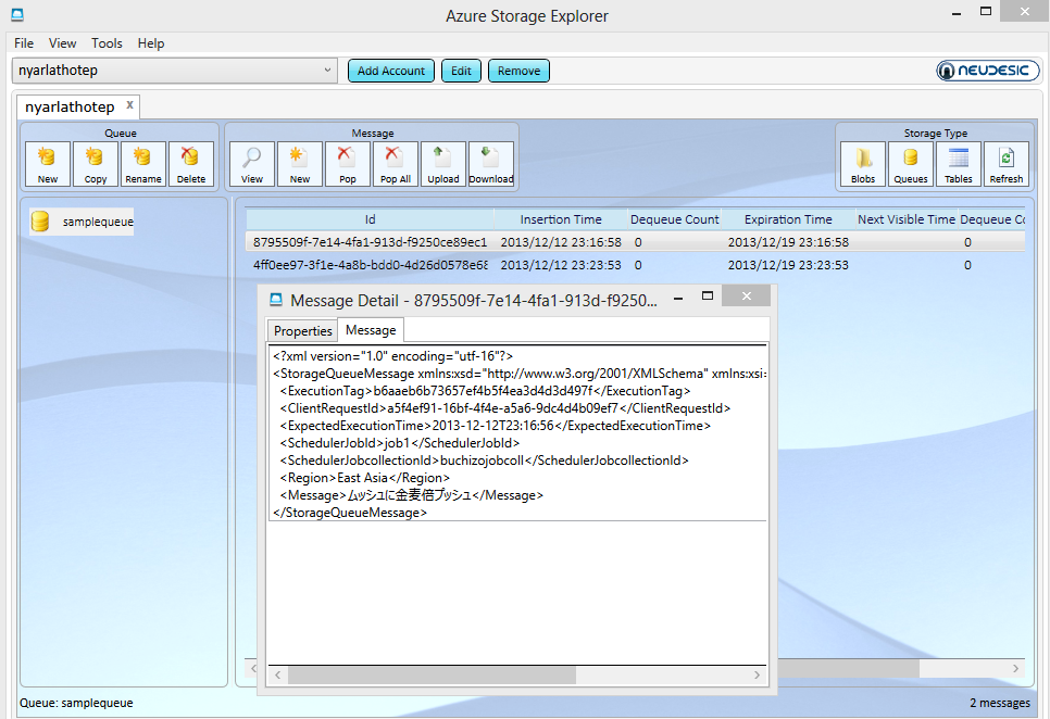 実際にストレージキューに投げてみるとこんな感じでちゃんとメッセージが入っていました。