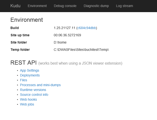 またKuduのサイトの動作(これはMonacoなども同じですが)に関するクォータ(CPU制限やメモリなど)はAzure Webサイトと同じで共有しています。なのであまりこちらでCPUやメモリを食ってしまうと本番のAzure Webサイトの動作に影響がでます。