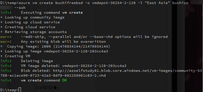 azure vm create <クラウドサービス名> -o vmdepot-36254-2-128 -l "East Asia" <ユーザー名> <パスワード> --ssh
