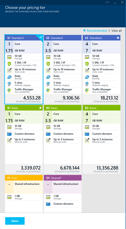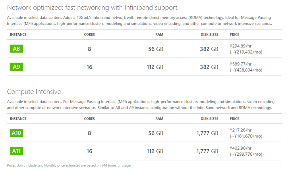 コンピュートサイズにA10とA11が追加されました。コア数・メモリ容量はA8/A9と同じなのですがA8/A9がネットワーク最適化(Network Optimized)なのに対し、A10/A11は計算集中(?)(Compute Intensive)ということのようです。