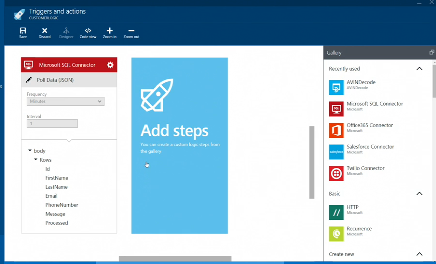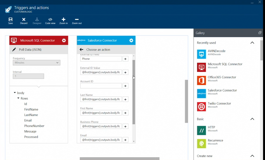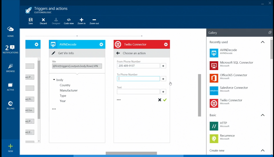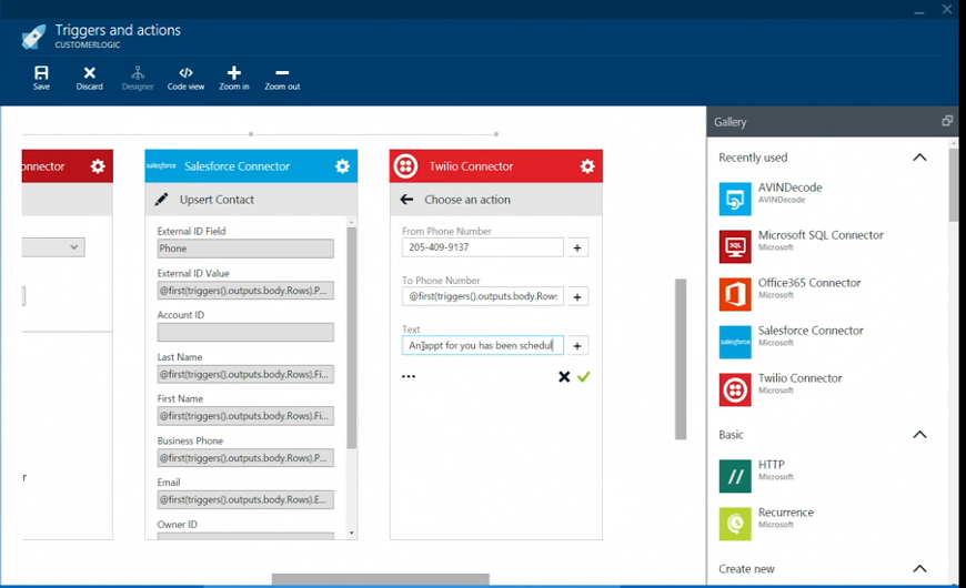 肝となるのはLogic AppsとAPI Appsです。Logic Appsを使ってDBの登録情報を基にCRMであるSalesforceから情報をとってきてTwilioでSMSを投げるという感じ。