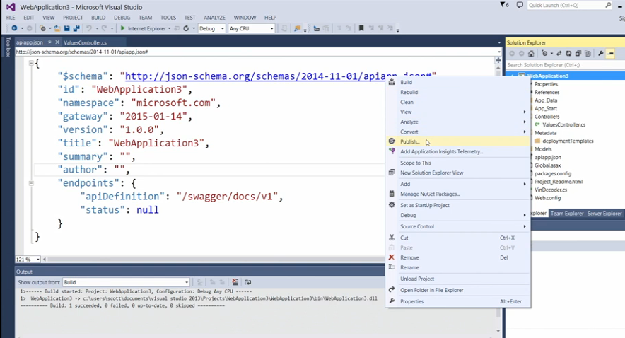 テンプレートから作るとAPI Appsとして必要なメタ情報もできあがるので(Swaggerでドキュメントまで!)発行します。