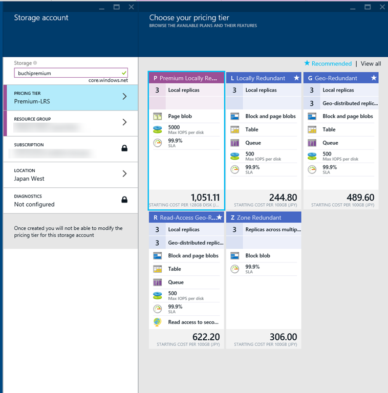 Previewからのとおり、仮想マシンで使うディスク専用となります。作成するディスクサイズに応じてP10~P30となっており、それぞれスループットの制限などありますので注意が必要です。(5,000 IOPS欲しかったら1024GB(P30)のディスクを使用します)